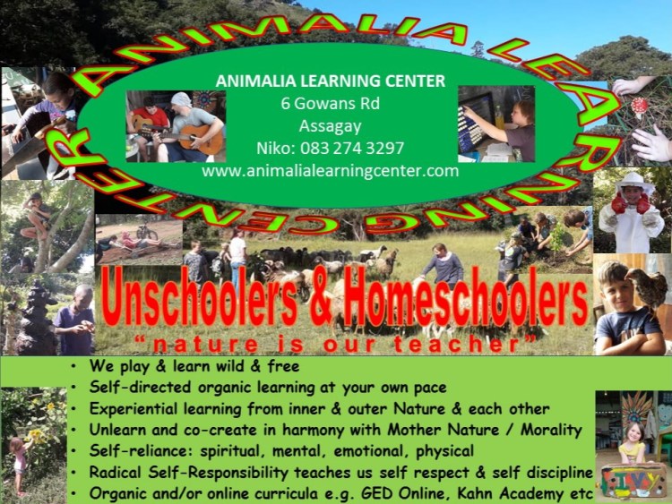 Animaliacs (any one/being participating in Animalia Learning Center’s activities) are a diverse, intimate, select and adventurous group of free thinking individuals whether human, insect, plant, rock, bird, chicken, lizard, duck, fungi, bacteria, viruses, parasites, minerals, air, soil, fire, water, etc. – colourful, eccentric and unique organic humans, all ages (our parents included!) and sizes and abilities – having fun learning and making learning fun. We are part of Nature. We ARE Nature. We are MORE than human – we are microbiota, more inter-being than human being! Our very survival is intricately interconnected to, and directly reliant on, our relationship with Nature, be it our own, each others’, and everything else under the sun – the sun included.